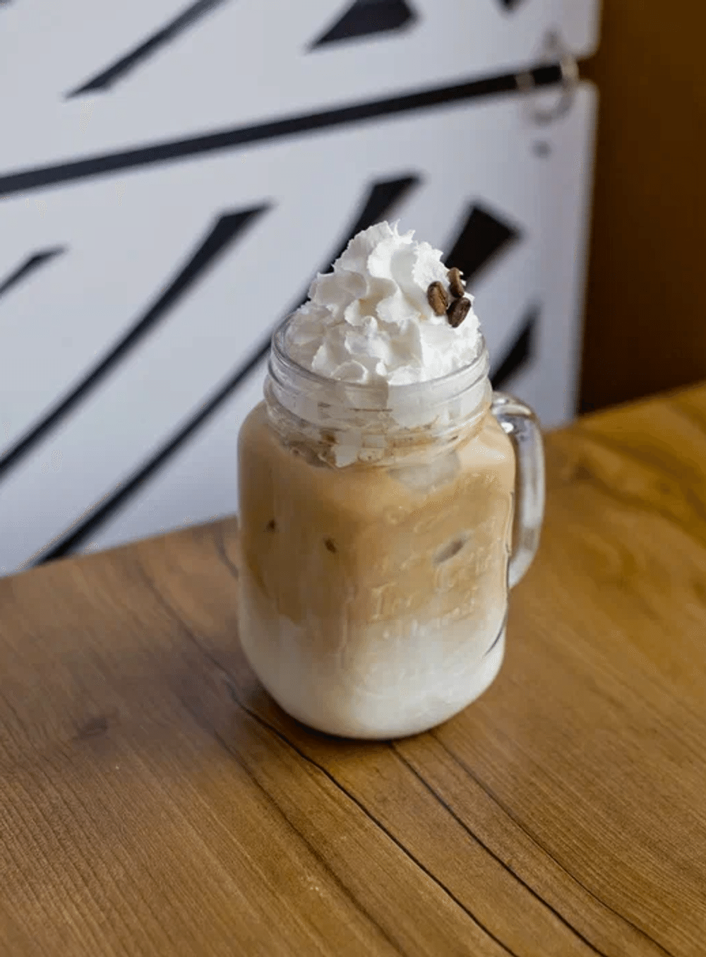 Эспрессо, молоко, взбитые сливки. По желанию можно добавить сироп.