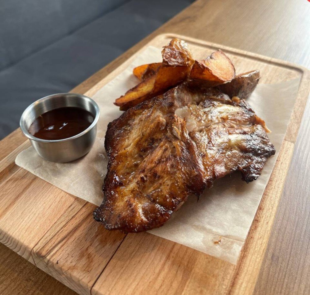 Рёбра свиные, соус медово-горчичный для маринада, картофель запечённый, соус BBQ. КБЖУ 662/15/51.9/33.6