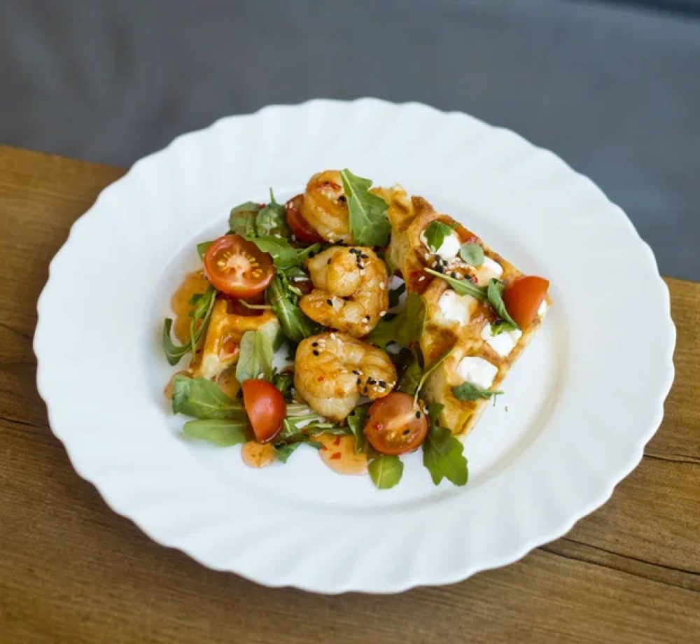 Микс салата, вафли, креветки, творожный сыр, томаты, соус сладкий чили КБЖУ 503/23.1/30.6/33.6