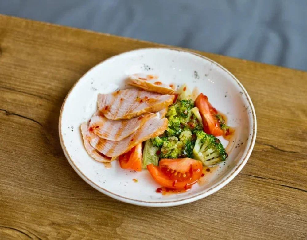 Филе копченой куриной грудки,брокколи, томат,соус Сладкий чили КБЖУ 313/24.2/19.4/10.2