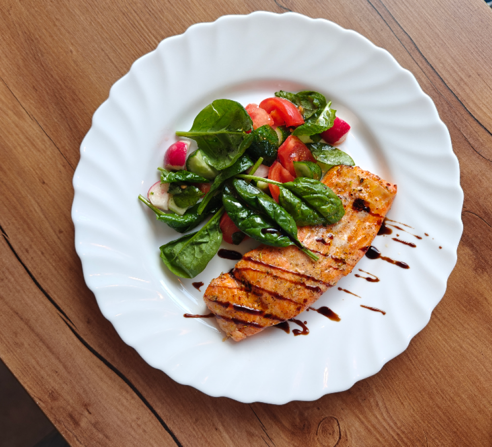 Форель,соль,перец,лимон,томат,огурец,масло растительное,шпинат. КБЖУ 380/47.5/19.1/4.2