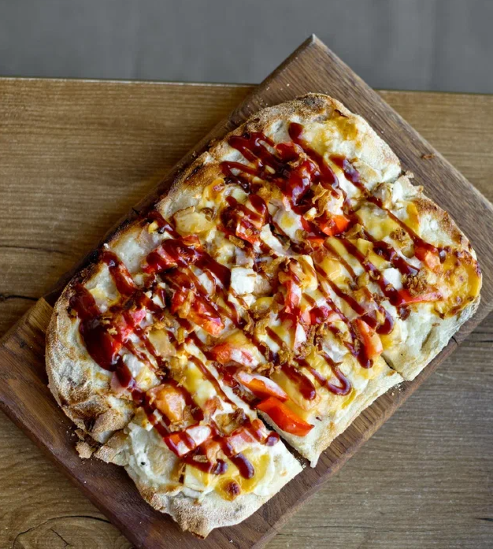 Куриное филе, бекон, перец болгарский, соус BBQ, соус сливочный, сыр чеддер, сыр моцарелла,, криспи-лук жареный. КБЖУ 1207/53.7/95.1/34