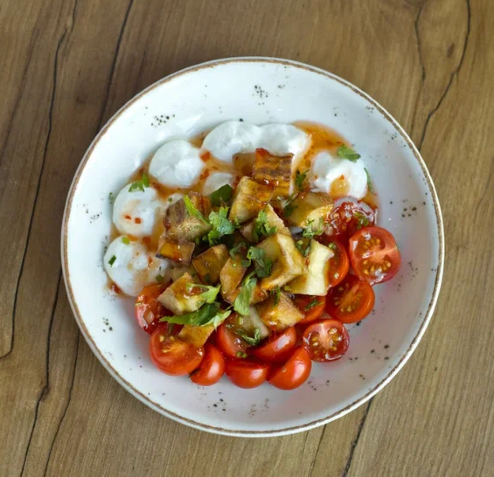 Баклажан обжаренный, помидор черри, сыр Сиртаки, соус сладкий чили, зелень КБЖУ 387/8/31/18.8
