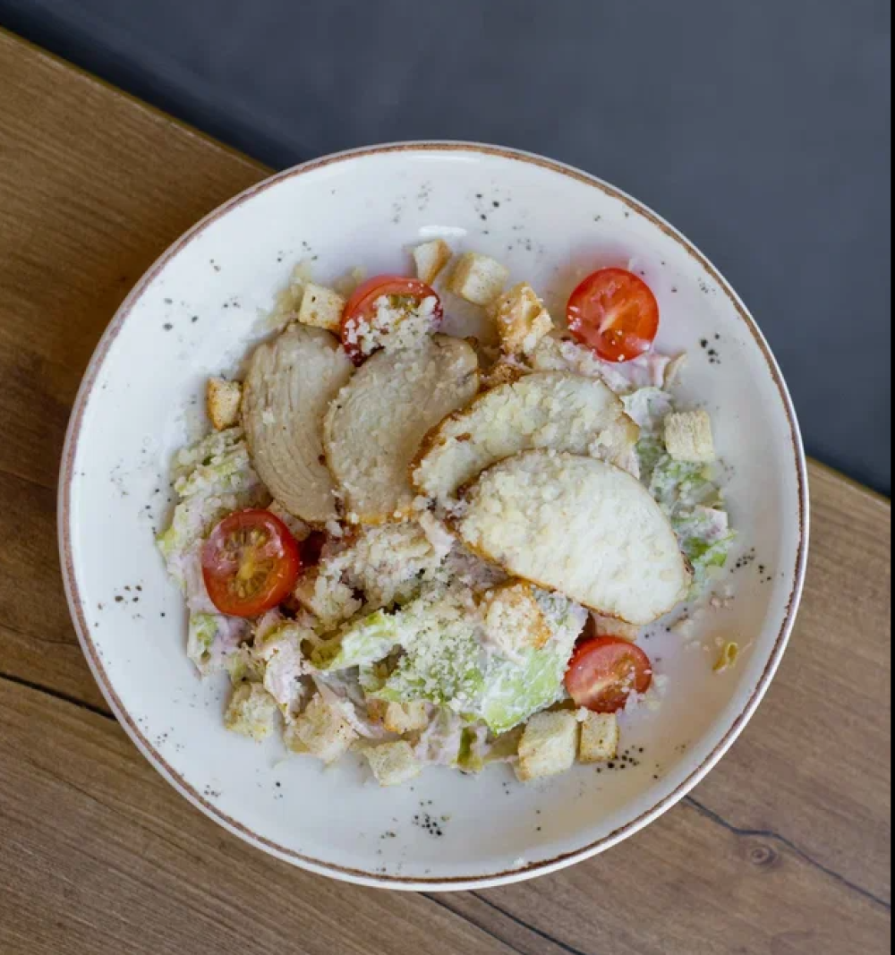Куриное филе, помидоры черри, сухарики, сыр пармезан, салат айсберг, соус Цезарь. КБЖУ 533/28/41.4/12.2