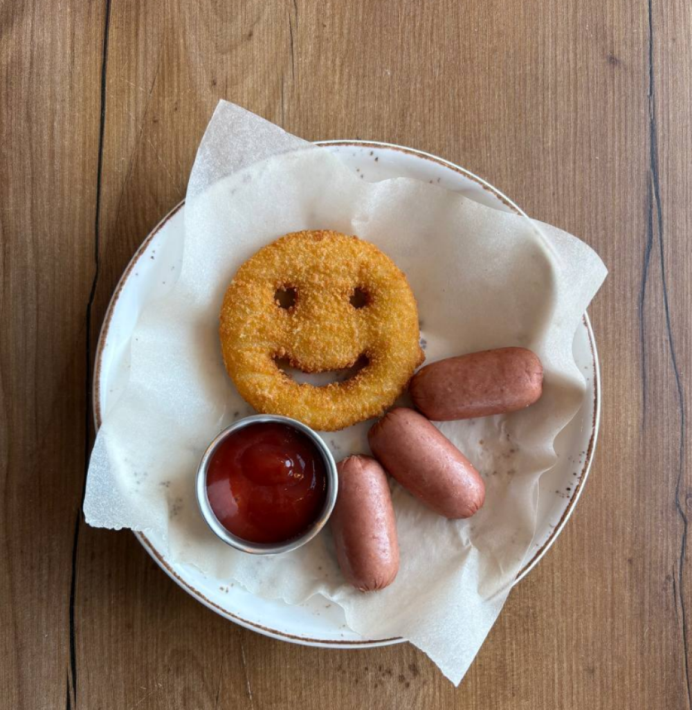 Картофельный снек из картофельного пюре, мини сосиски, кетчуп.