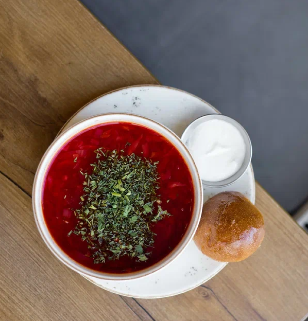 Говядина, капуста белокочанная, картофель, лук репчатый, морковь столовая свежая, свёкла, томатная паста, уксус, чеснок, зелень укропа, соль поваренная пищевая, сахар-песок, сметана, пампушка. КБЖУ 549/20.4/24.8/61