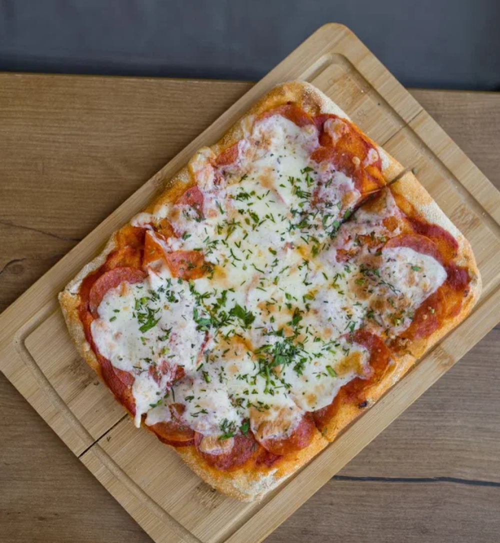 Основа для пинцы, моцарелла, колбаса пепперони, орегано, фирменный соус томатный. КБЖУ 825/42.4/63.4/21.3