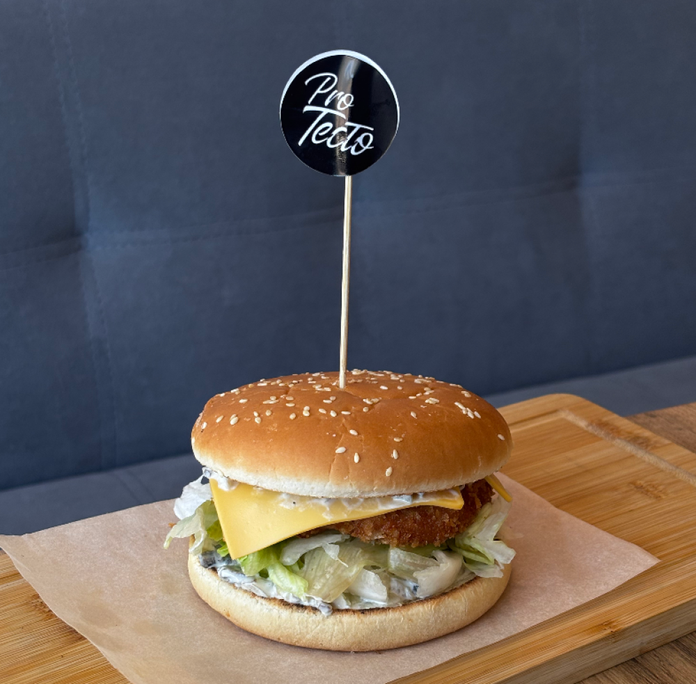 Котлета куриная из филе бедра куриного, сыр чеддер, айсберг салат,соус на основе сливок, маринованного огурца и грибов КБЖУ 577/17.3/34/50.3