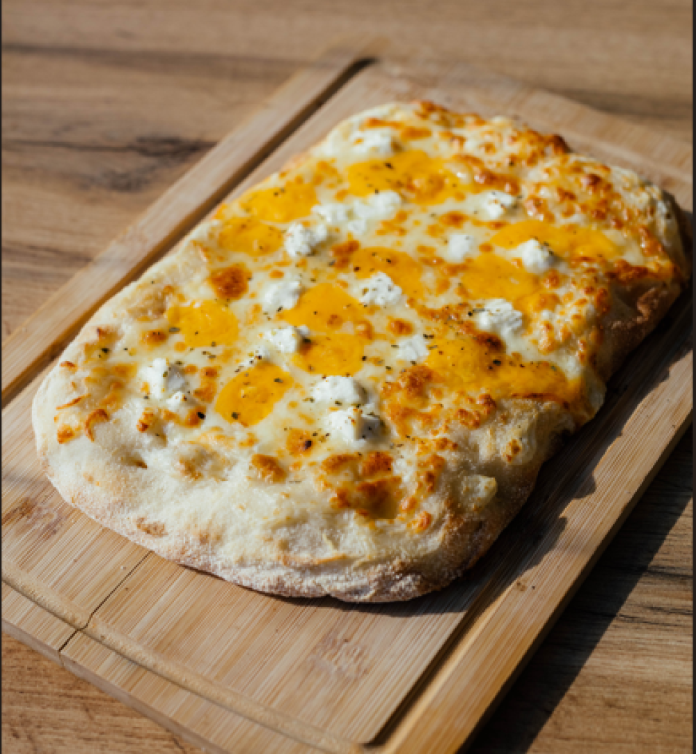 Основа для пинцы, сыр моцарелла, гауда, чеддер, фета, прованские травы, сливочно-чесночный соус. КБЖУ 969/42.3/77.6/25.3