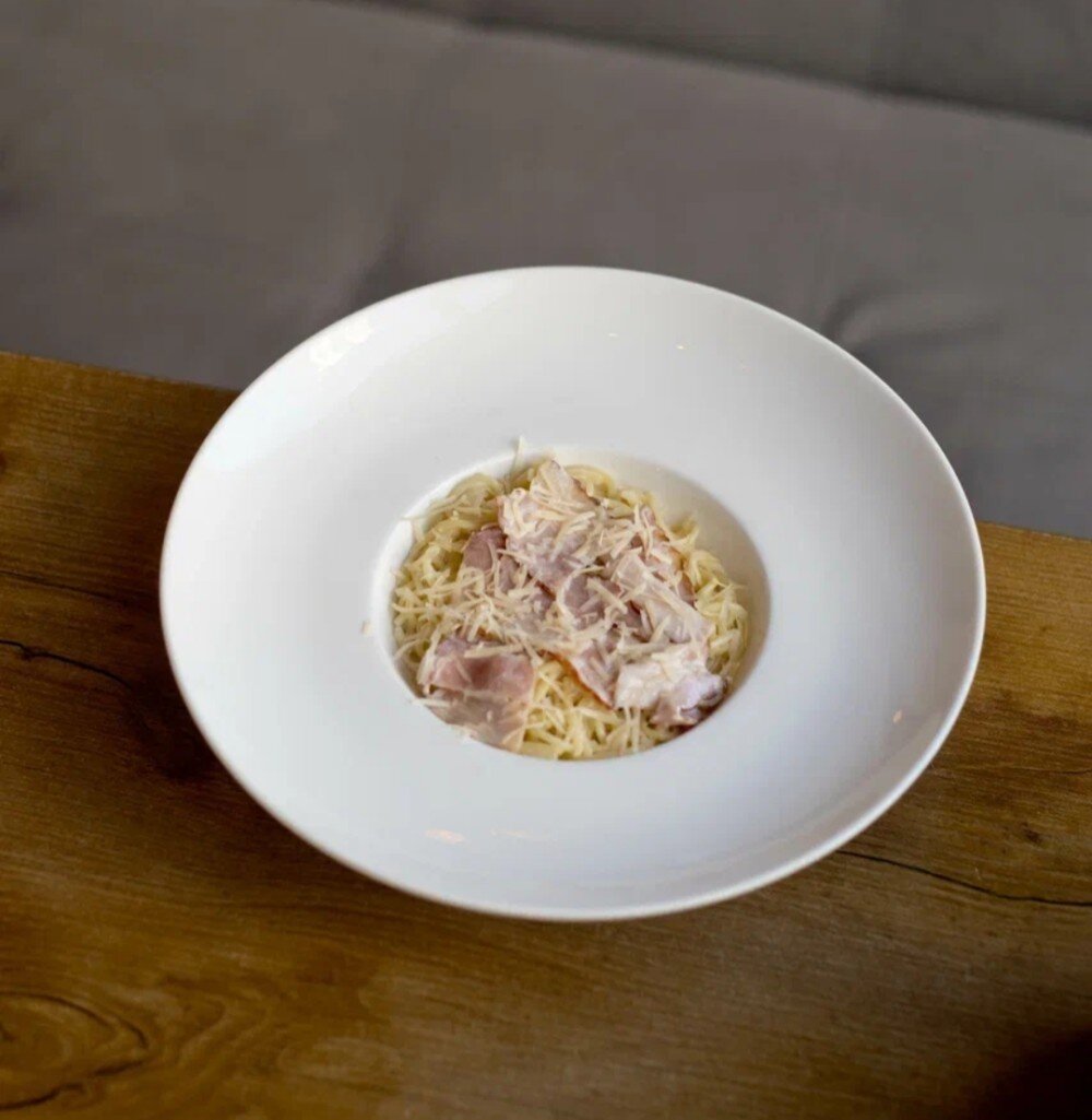 Спагетти,сливки,бекон,желток яичный,масло чесночное,пармезан. КБЖУ 767/19.8/58.1/41.1