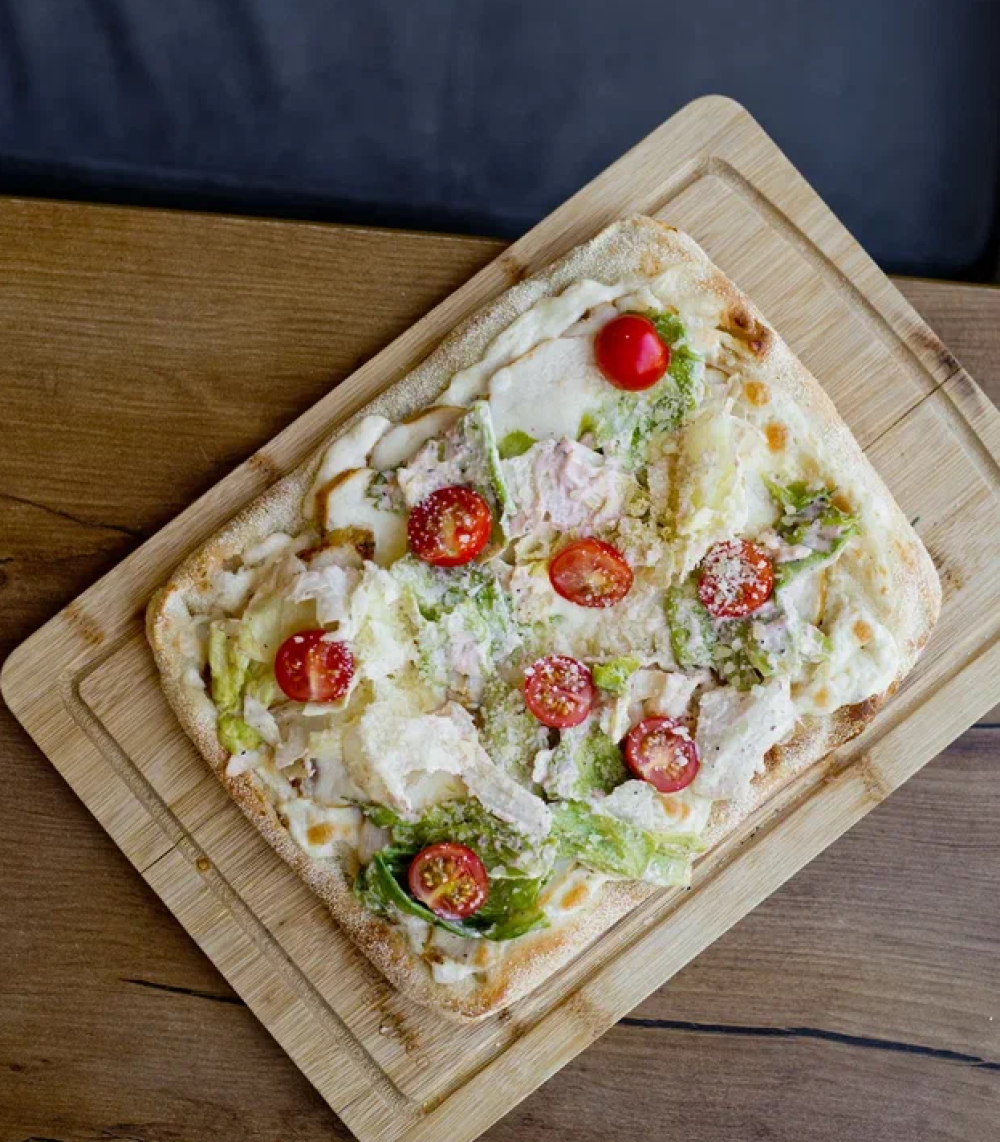Основа для пинцы,куриное филе, салат айсберг,соус Цезарь,соус сливочно-чесночный,томаты черри,пармезан. КБЖУ 1432/63.6/120/24.2
