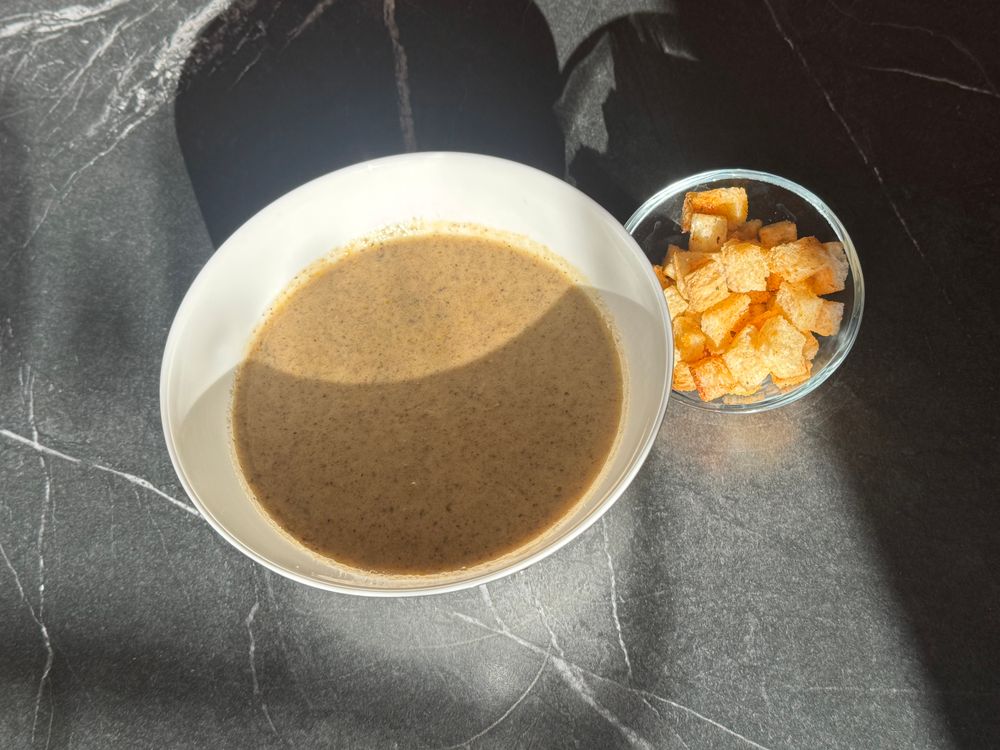 Сливки, шампиньоны, масло сливочное, лук, сухарики