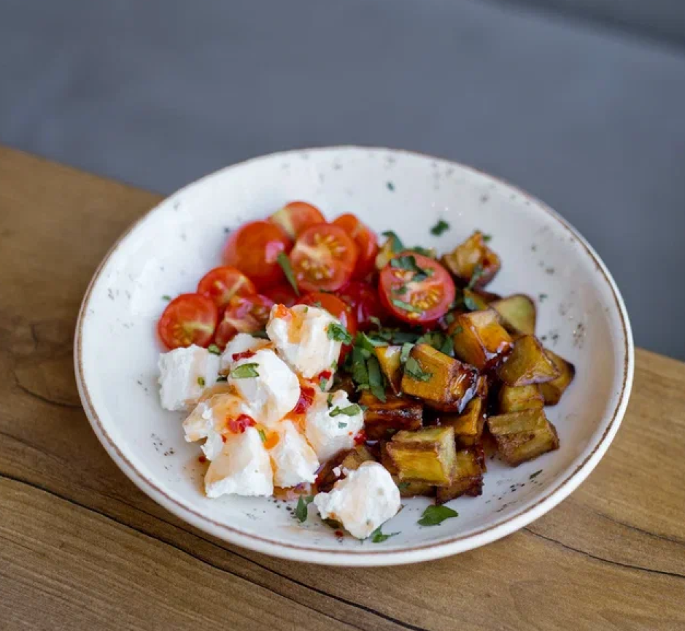 Баклажан обжаренный, помидор черри, сыр Сиртаки, соус сладкий чили, зелень