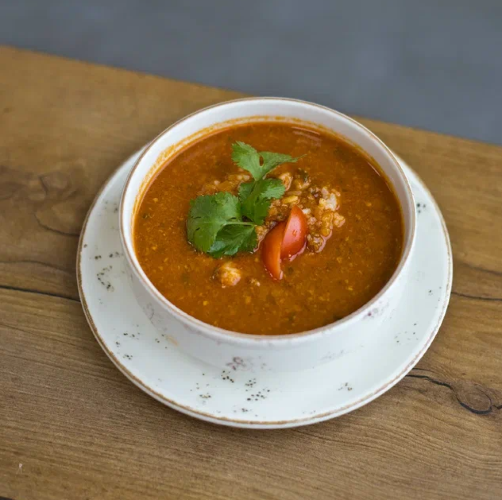 Говядина, рис, картофель, лук, морковь, томатная паста, перец красный, кинза